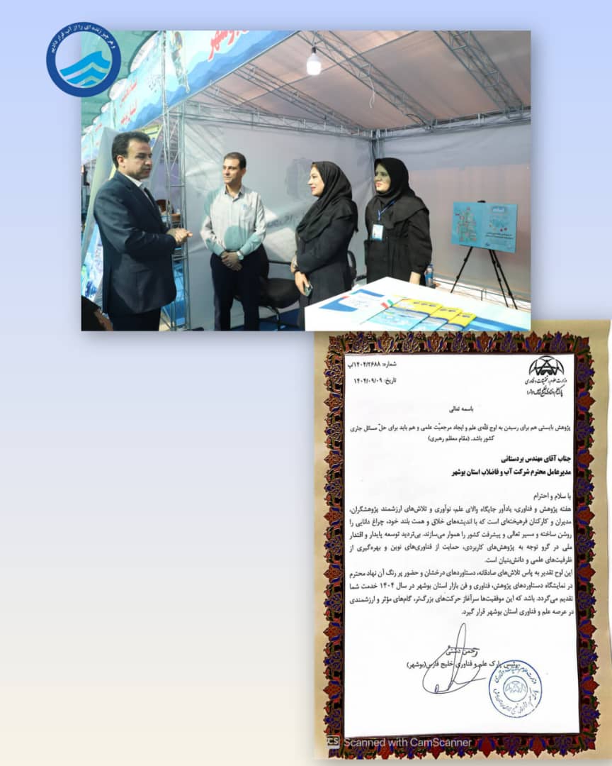 در حاشیه این برنامه، رحمان دشتی رئیس پارک علم و فناوری خلیج فارس بوشهر با اهدای لوح تقدیر از فعالیت‌های پژوهشی شرکت آب و فاضلاب استان بوشهر تجلیل کرد.